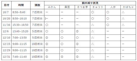 ※エサの減り程度が◎:非常に多い、○:多い、△:少ない